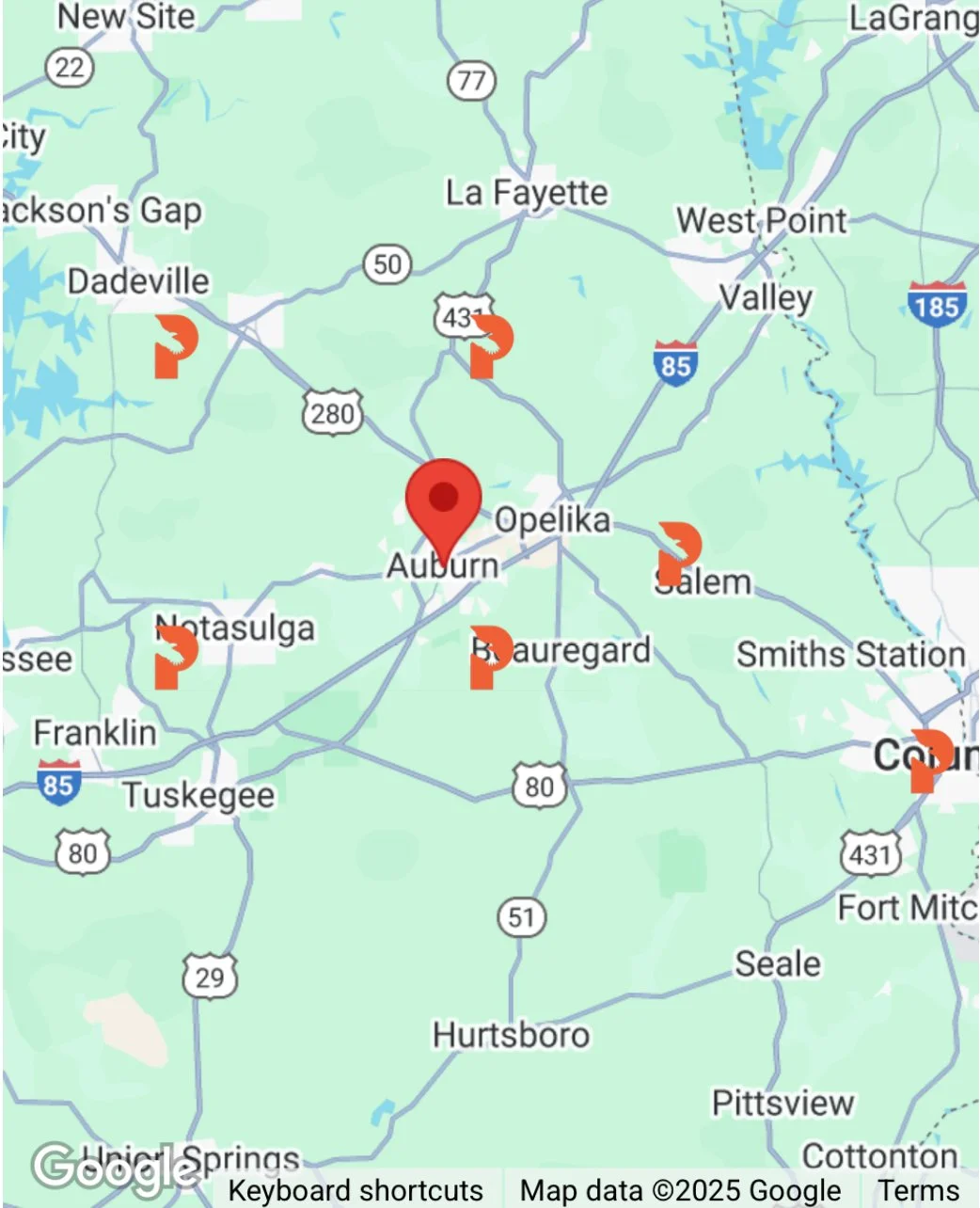 Map showing Auburn, Alabama with surrounding areas and marked locations, including Dadeville, Opelika, and Tuskegee.